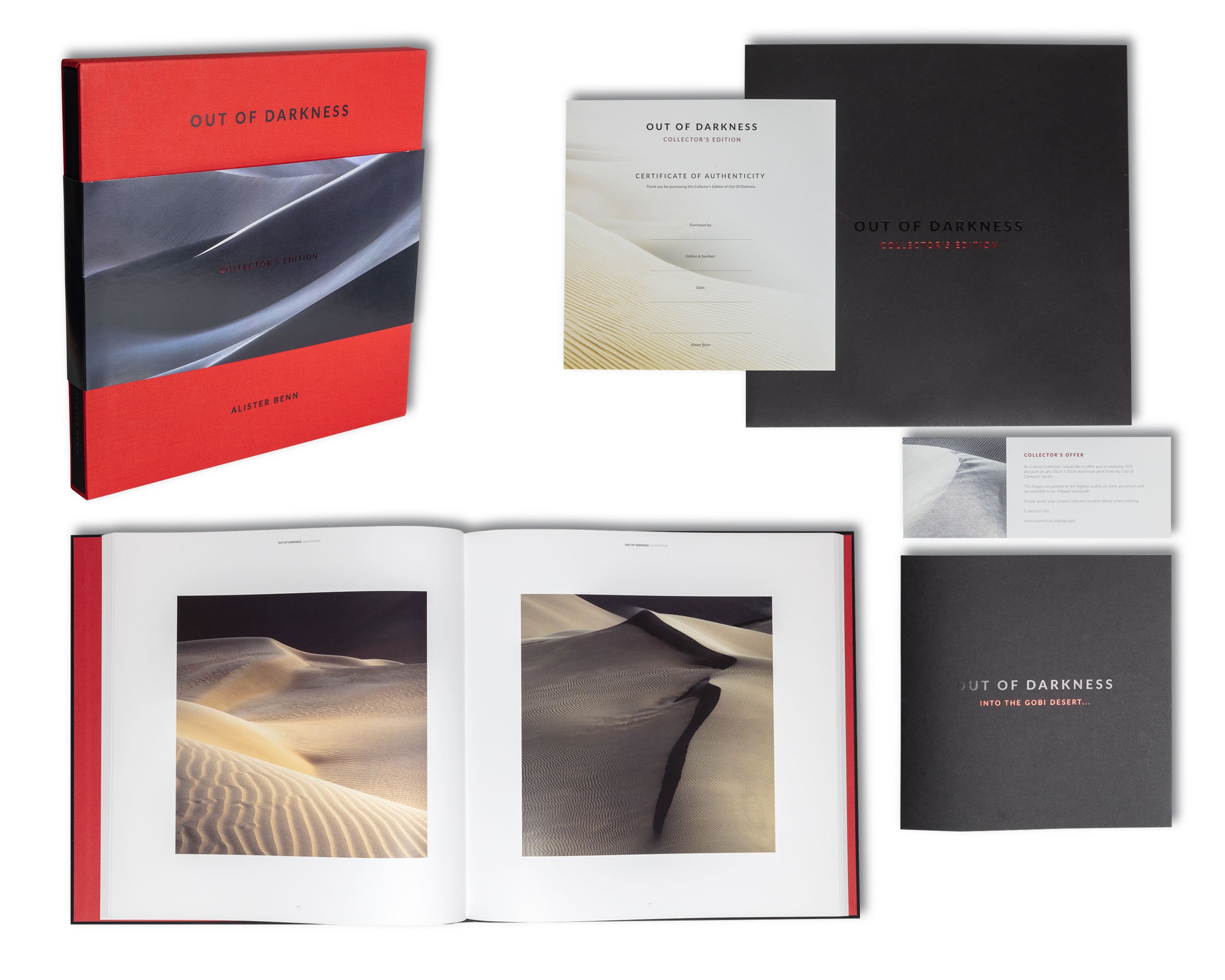 The book also came as a special Collectors Edition which included a large cloth bound and foiled presentation box to include a slipcase bound book, prints, a book about the journey in to the Gobi and also a musical score on a small USB drive which was composed and played by Alister.